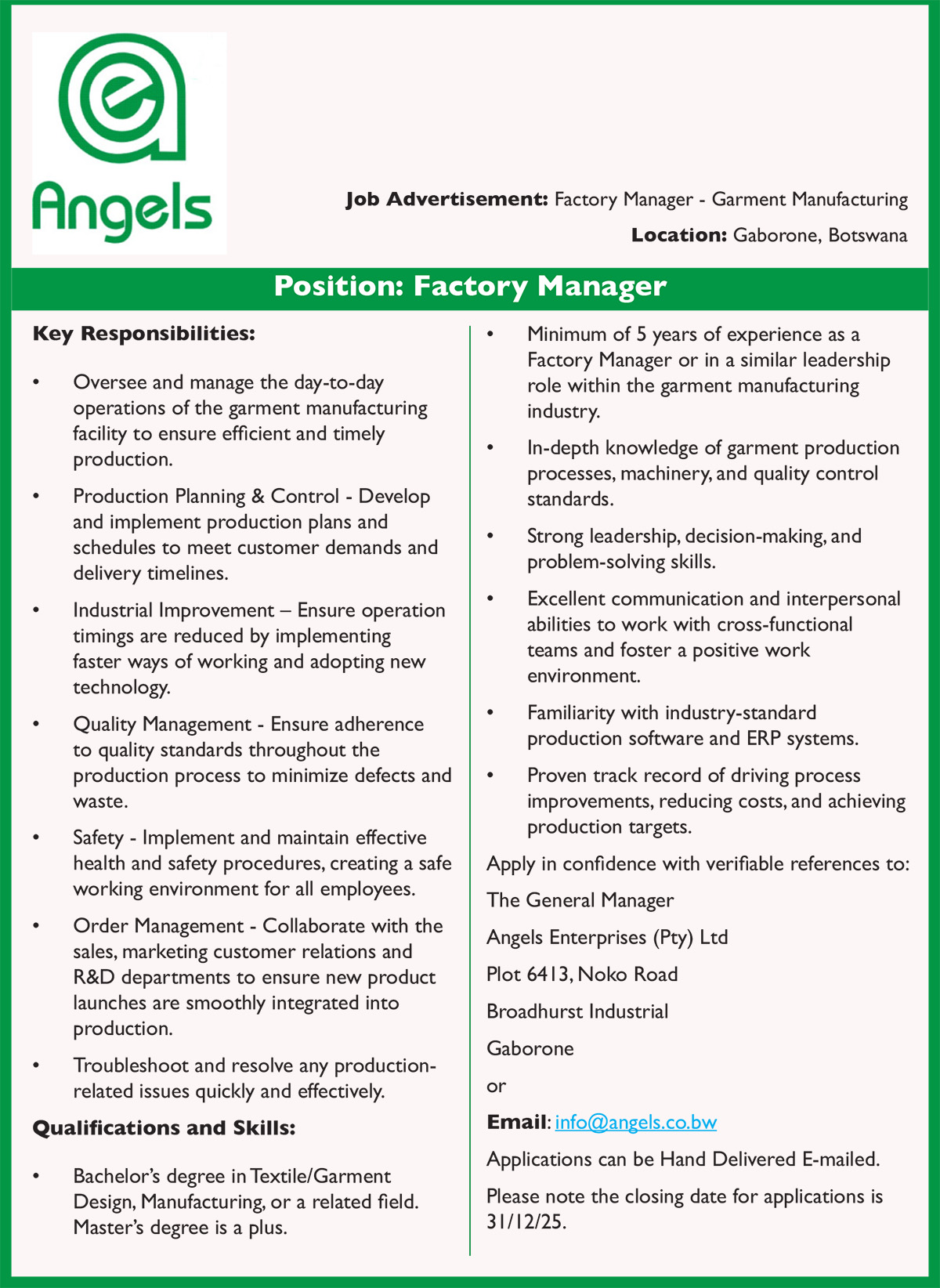 Job Advertisement: Factory Manager-Garment Manufacturing