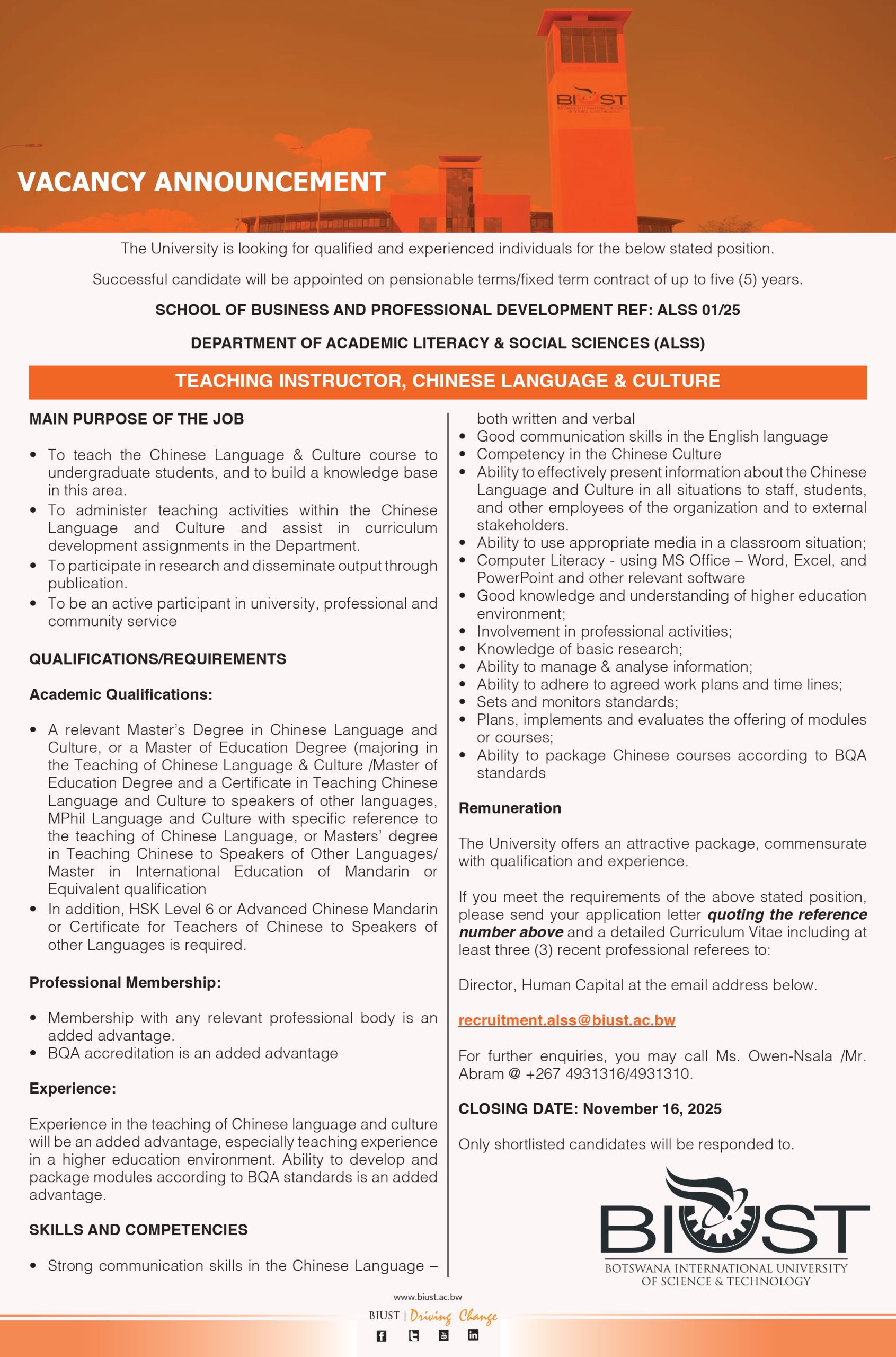 • BIUST VACANCY – TEACHINGINSTRUCTOR,CHINESELANGUAGE&CULTURENovember 14, 2025