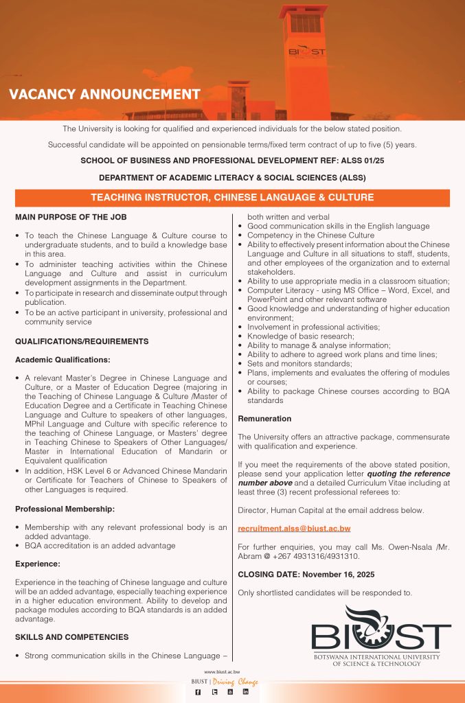 BIUST VACANCY – TEACHINGINSTRUCTOR,CHINESELANGUAGE&CULTURE