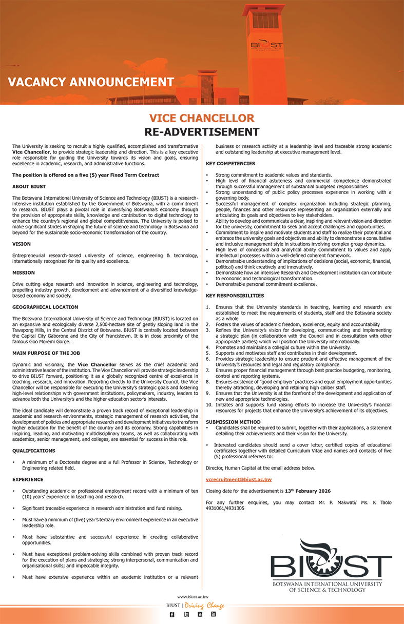Dynamic and visionary, the Vice Chancellor serves as the chief academic and administrative leader of the institution. The Vice Chancellor will provide strategic leadership to drive BIUST forward, positioning it as a globally recognized centre of excellence in teaching, research, and innovation. Reporting directly to the University Council, the Vice Chancellor will be responsible for executing the University’s strategic goals and fostering high-level relationships with government institutions, policymakers, industry, leaders to advance both the University’s and the higher education sector’s interests.