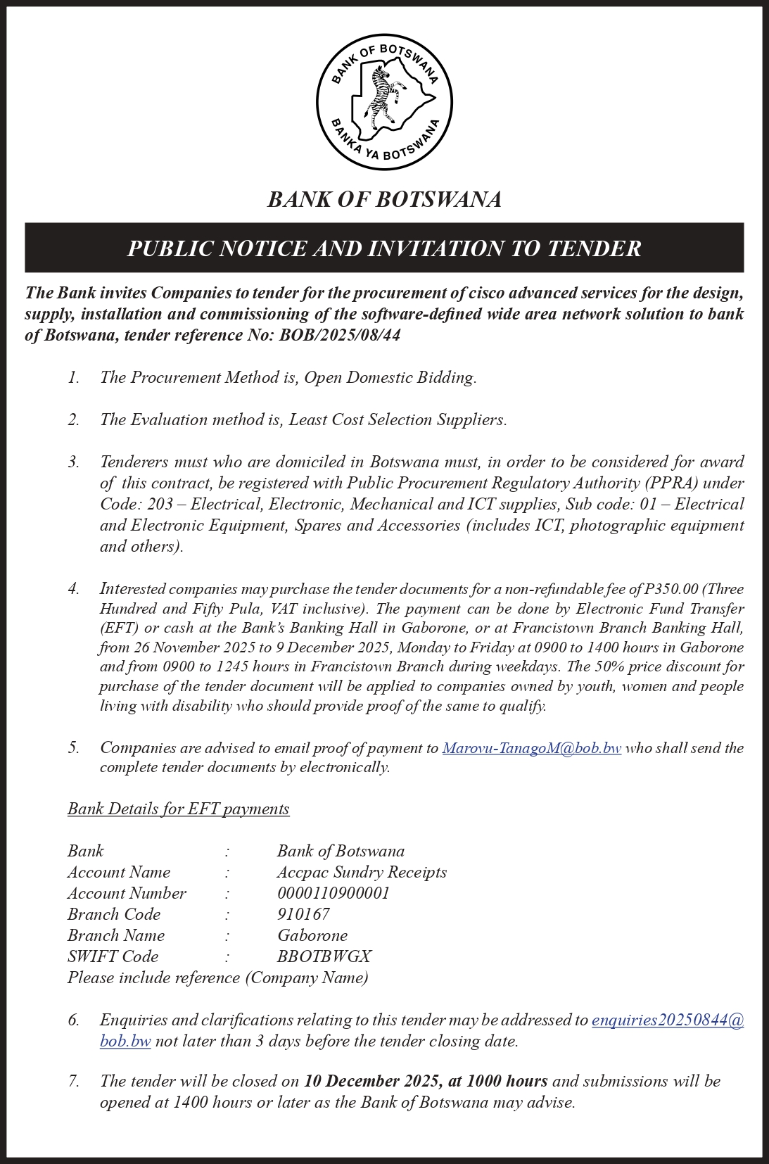 The Bank invites Companies to tender for the procurement of cisco advanced services for the design, supply, installation and commissioning of the software-defined wide area network solution to bank of Botswana, tender reference No: BOB/2025/08/44