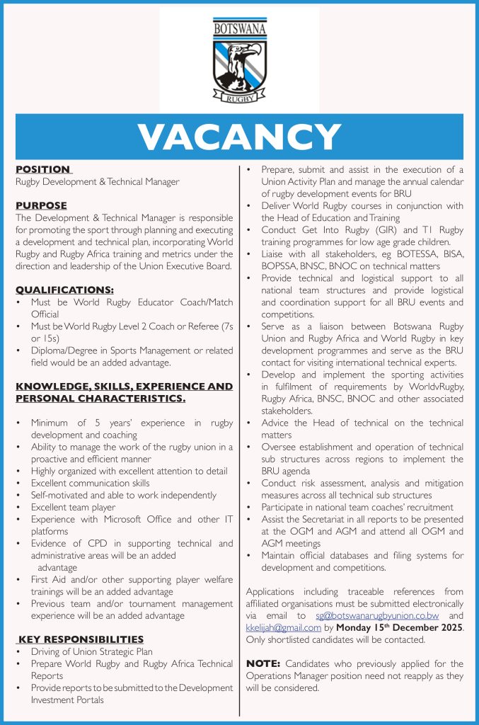 Applications including traceable references from affiliated organisations must be submitted electronically via email tosg@botswanarugbyunion.co.bwand kkelijah@gmail.combyMonday15thDecember2025. Only shortlisted candidates will be contacted.