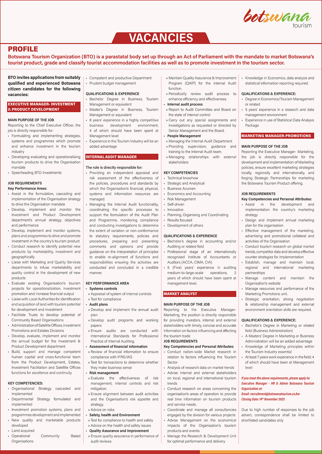 Email:recruitment@botswanatourism.co.bwClosingDate:14thNovember2025