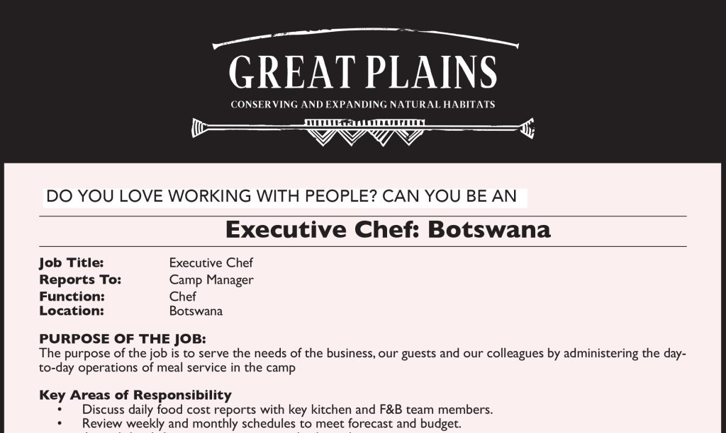 GREAT PLAINS VACANCY – Executive Chef: Botswana