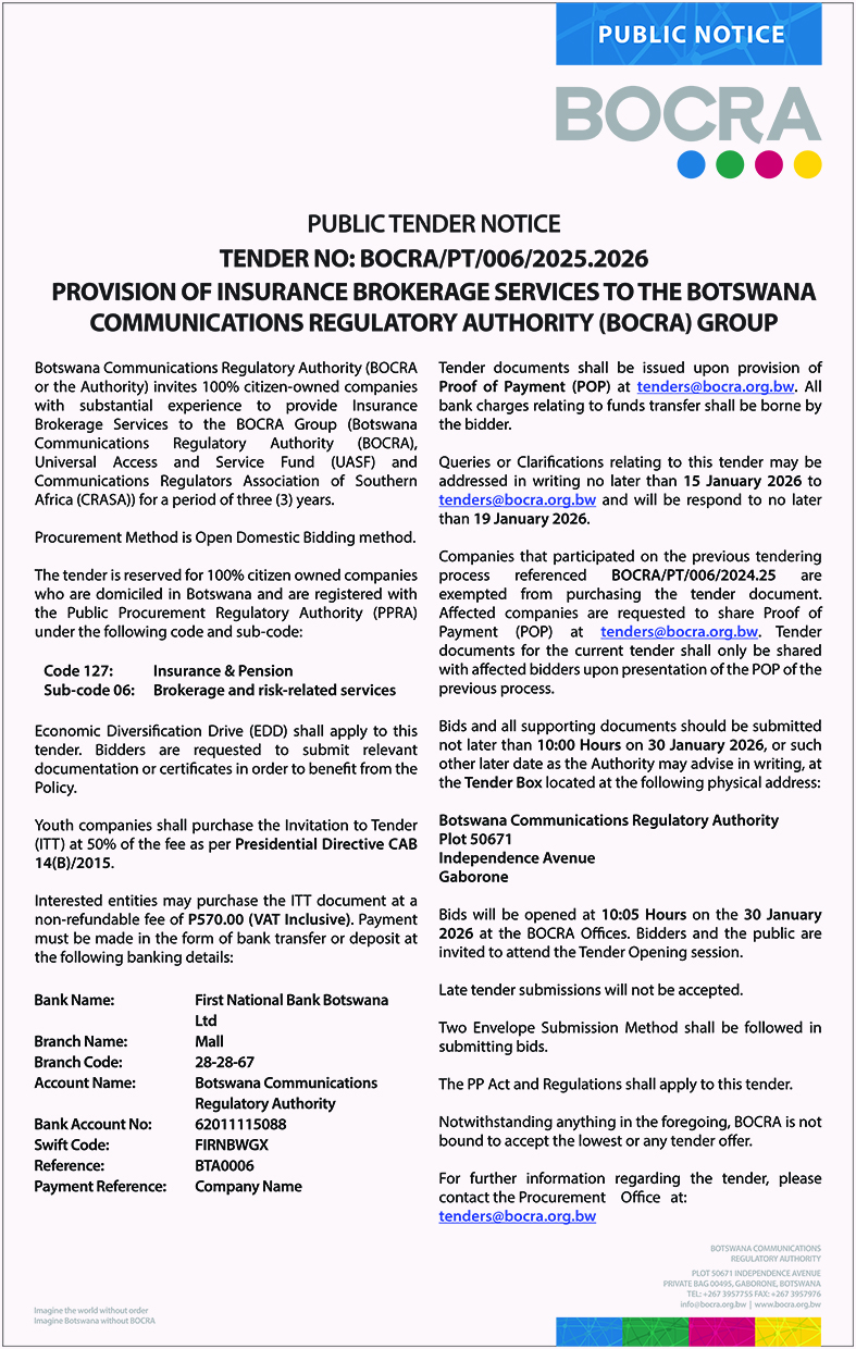 Botswana Communications Regulatory Authority (BOCRA or the Authority) invites 100% citizen-owned companies with substantial experience to provide Insurance Brokerage Services to the BOCRA Group (Botswana Communications Regulatory Authority (BOCRA), Universal Access and Service Fund (UASF) and Communications Regulators Association of Southern Africa (CRASA))for a period of three (3)years.