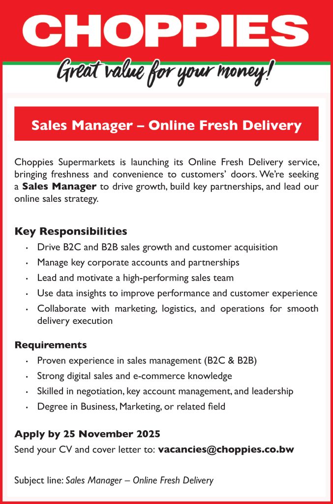 Choppies Supermarkets is launching its Online Fresh Delivery service, bringing freshness and convenience to customers’ doors. We’re seeking a Sales Manager to drive growth, build key partnerships, and lead our online sales strategy.
