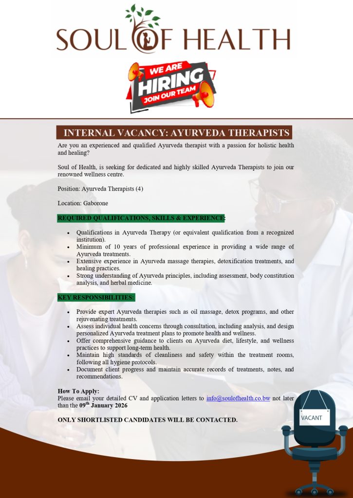 Please email your detailed CV and application letters to info@soulofhealth.co.bw not later than the 09th January 2026
