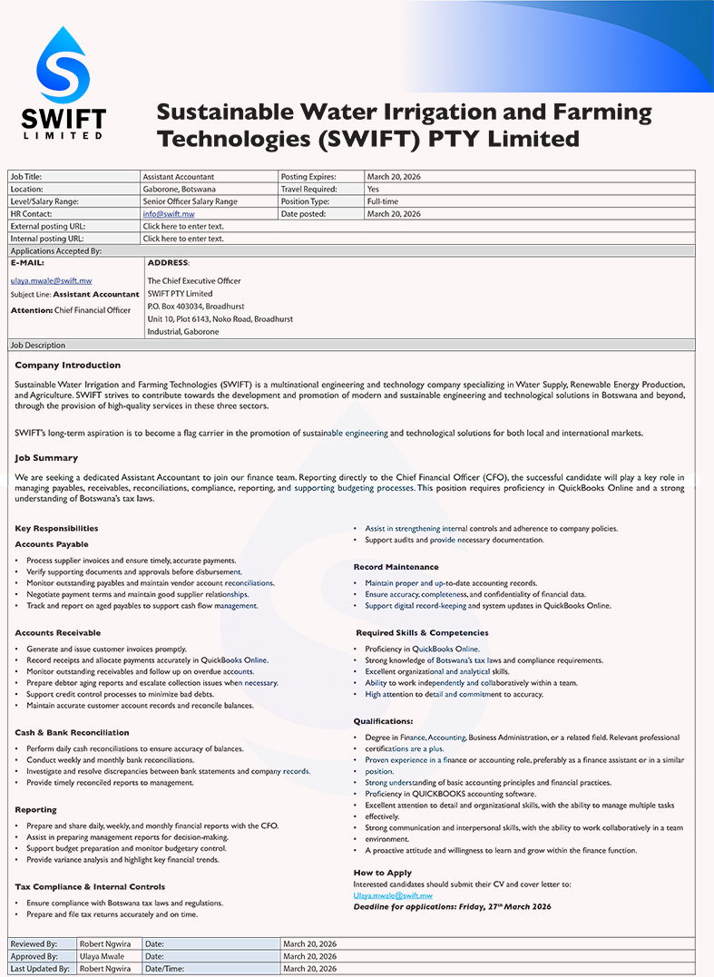 • Strong knowledge of Botswana’s tax laws and compliance requirements.