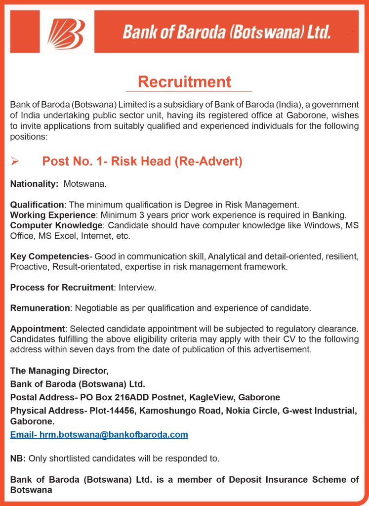 Bank of Baroda (Botswana) Limited is a subsidiary of Bank of Baroda (India),a government of India undertaking public sector unit, having its registered office at Gaborone, wishes to invite applications from suitably qualified and experienced individuals for the following positions: